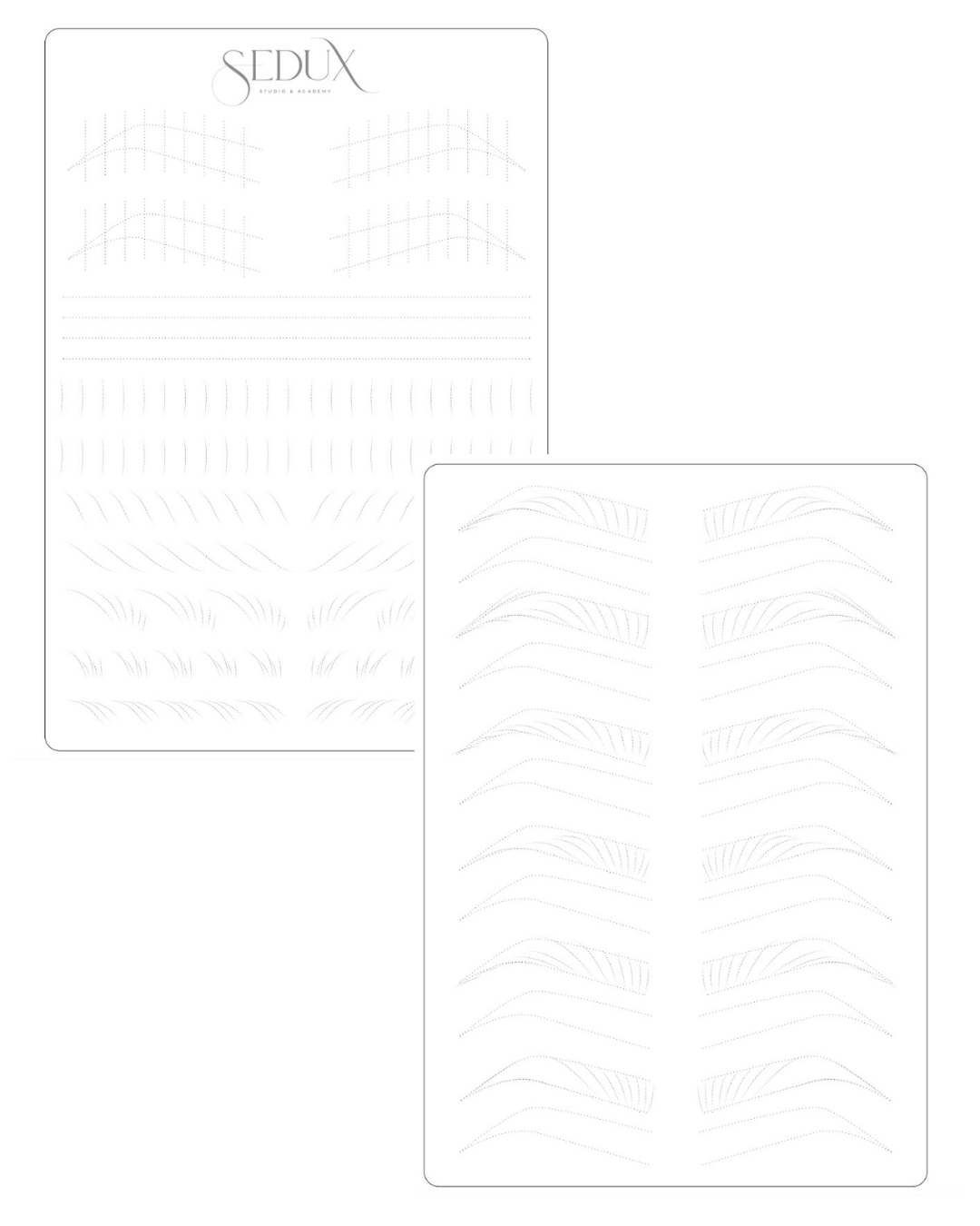 Level up your PMU skills with this double-sided latex skin pad featuring 6 different combo brow patterns and a variety of shading and hairstroke practice outlines.